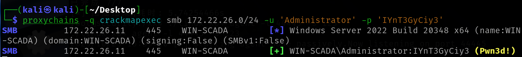 proxychains -q crackmapexec smb 172.22.26.0/24 -u 'Administrator' -p 'IYnT3GyCiy3'