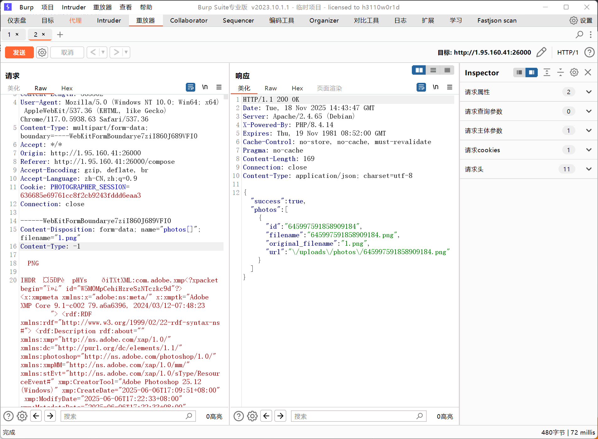 注意由于上传图片会被检测是否为图片,所以我们上传的图片内容必须是正常图片的内容,否则会上传失败