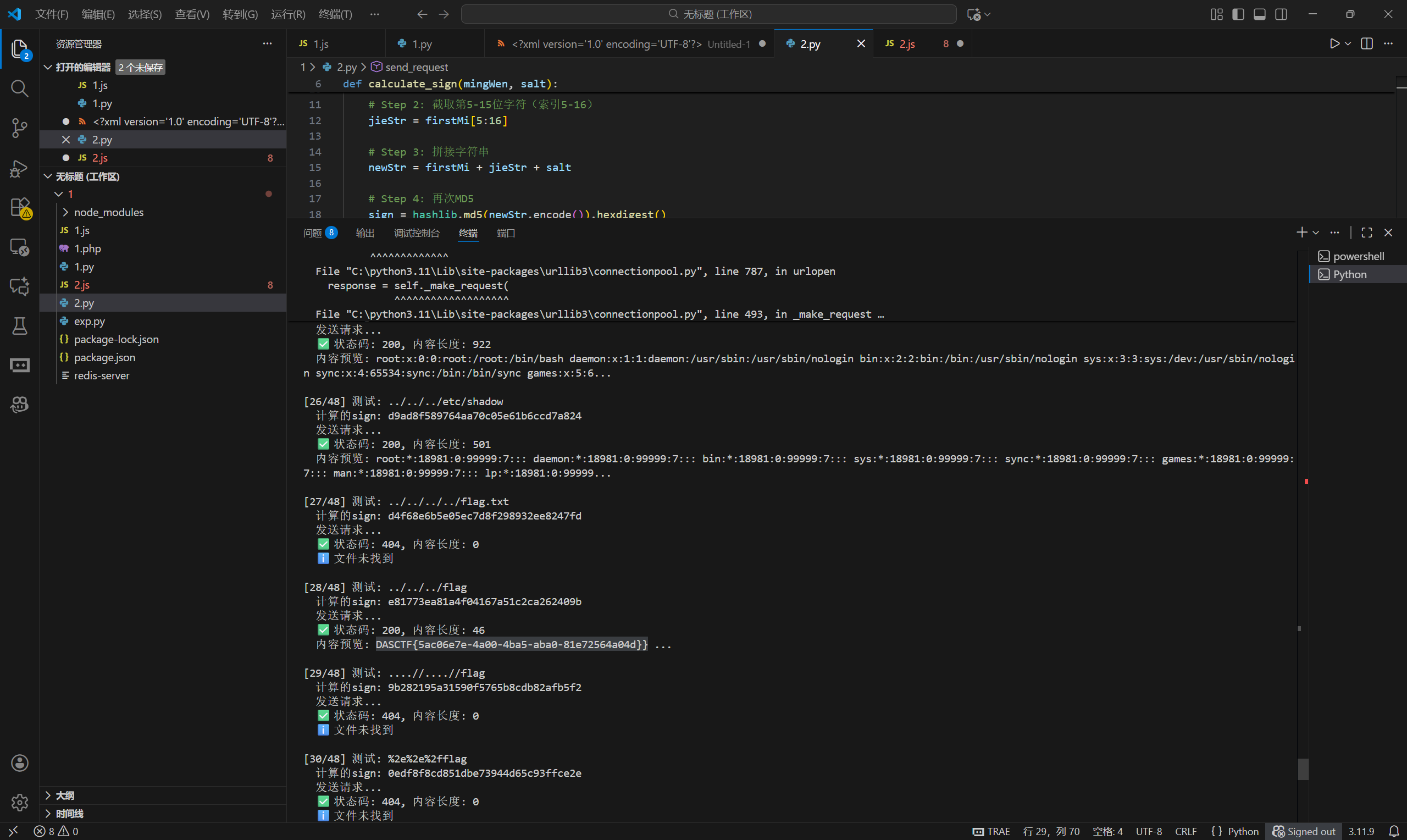 def calculate_sign(mingWen, salt): """计算签名""" # Step 1: 对明文进行MD5 firstMi = hashlib.md5(mingWen.encode()).hexdigest() # Step 2: 截取第5-15位字符(索引5-16) jieStr = firstMi[5:16] # Step 3: 拼接字符串 newStr = firstMi + jieStr + salt # Step 4: 再次MD5 sign = hashlib.md5(newStr.encode()).hexdigest() return sign